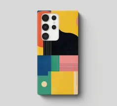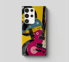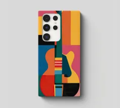 A modern abstract painting featuring geometric shapes forming guitars, violins, and musical notes in a bold, colorful composition. The textured background and dynamic arrangement evoke a sense of rhythm and artistic expression.