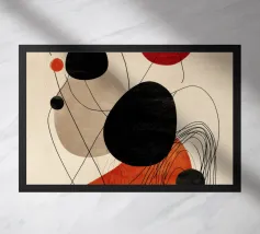 An abstract composition features bold geometric shapes and primary colors, such as red, blue, green, and yellow. The arrangement includes circles, lines, and curves that create a sense of movement and balance.