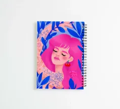 Cette œuvre d'art représente un personnage aux cheveux roses, sur un fond rempli d'éléments floraux bleus et roses. La scène est vibrante et fantaisiste, pleine d'énergie ludique.