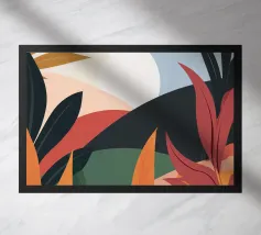 Composition abstraite moderne de diverses formes botaniques stylisées et de feuilles dans une palette de terracotta, de beige et de bleu foncé sur un fond clair.