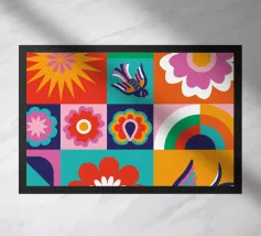 Un charmant patchwork d'icônes de jardin mignonnes et colorées, dont une abeille amicale, un arc-en-ciel, un soleil souriant et une coccinelle. Cette œuvre d'art est une pure expression de joie et d'émerveillement enfantin.
