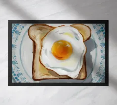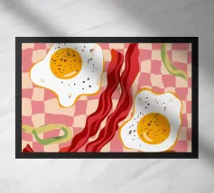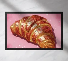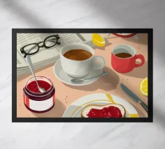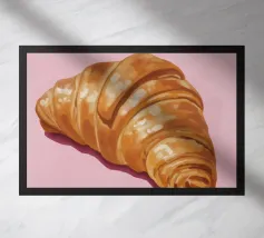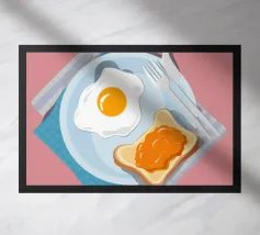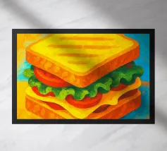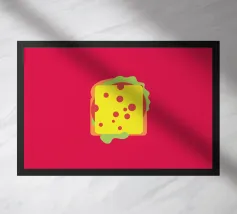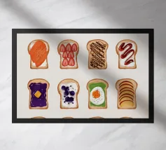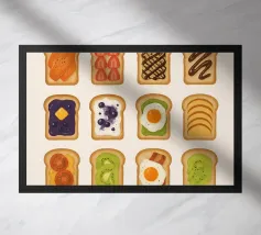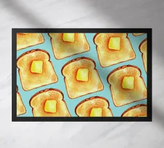 Une pile de trois tranches de pain grillé recouvertes d'une généreuse couche de confiture rouge vif se détache sur un fond à carreaux roses et blancs. La représentation réaliste du pain contraste avec l'arrière-plan ludique et géométrique.