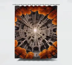 Cette image présente une architecture circulaire complexe avec des colonnes de pierre ornées, une statue centrale et un plafond de verre. La perspective surréaliste crée un effet de tunnel, attirant l'œil vers le centre de la composition.