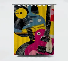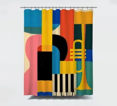 A modern abstract painting featuring geometric shapes forming guitars, violins, and musical notes in a bold, colorful composition. The textured background and dynamic arrangement evoke a sense of rhythm and artistic expression.