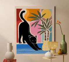 art du chat noir, impression de chat tropical, poster abstrait de la jungle, art mural animalier moderne, illustration colorée de la nature, décor félin audacieux, art minimaliste de la faune, art des feuilles tropicales, poster soleil vibrant, décor boho de la jungle, art géométrique de vase, design de chat contemporain, impression d'animal exotique, scène tropicale abstraite, poster artistique de chat, décor mural élégant de la maison, silhouette d'animal de la jungle, impression moderne colorée, œuvre d'art de palmier, art de la jungle au coucher du soleil