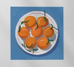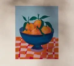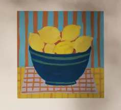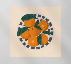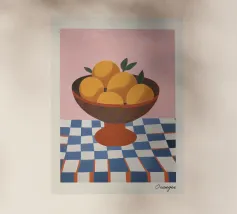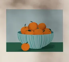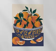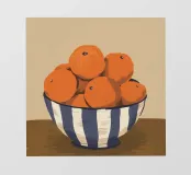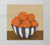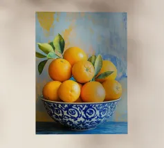 Un bol classique et intemporel à rayures bleues et blanches est rempli à ras bord d'agrumes orange vif. Cette nature morte fraîche et épurée évoque le charme méditerranéen et la joie simple des fruits frais et sains.