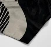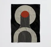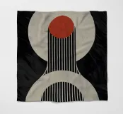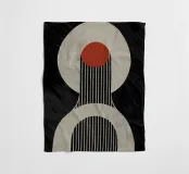 Une composition géométrique présente un grand cercle entrecoupé de lignes verticales, surmonté d'un cercle rouge audacieux. Les éléments monochromes contrastent avec un fond sombre et tourbillonnant.