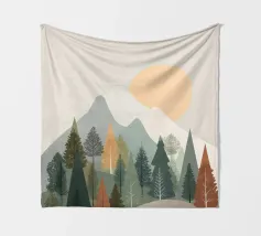 Une peinture de paysage vibrante et géométrique représentant un coucher de soleil sur une forêt. Les couleurs vives et les formes abstraites créent une esthétique frappante et moderne.
