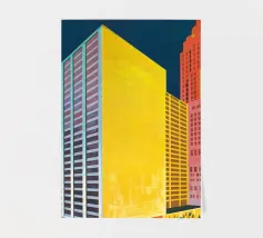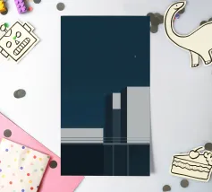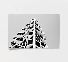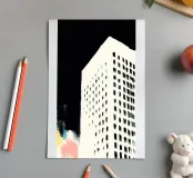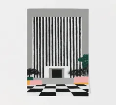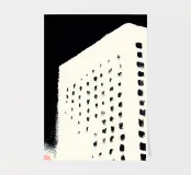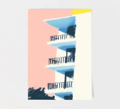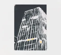 Illustration Risograph simple d'un bâtiment blanc sur fond noir. Lignes et formes minimalistes, combinées à des accents de couleur rose clair et beige foncé. Mélange d'aspect aquarelle, d'impressions en bloc audacieuses et d'effets texturés palette-nife.
