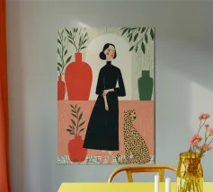 Cette œuvre d'art représente une personne vêtue d'une robe noire qui prend une pose posée à côté d'un léopard. La scène respire la sophistication, la confiance et l'art intemporel.