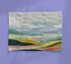 Une vue pittoresque de champs en patchwork ondulés, rendus dans des pastels audacieux, créant un paysage onirique.