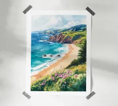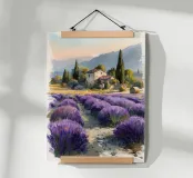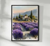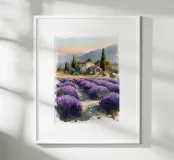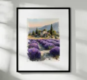 Aquarelle d’un mas en pierre entouré de rangées de lavande violette baignées par la lumière dorée du soir. En arrière-plan, cyprès élancés et collines bleutées complètent ce paysage typique du sud de la France. Une affiche chaleureuse et parfumée d’été, parfaite pour apporter douceur, couleur et atmosphère de Provence à votre décoration intérieure.