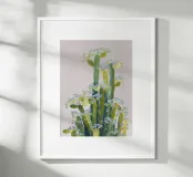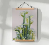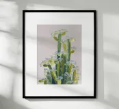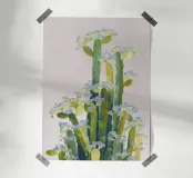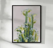 Cette œuvre d'art délicate représente des cactus verts avec des fleurs bleu clair, peints dans des couleurs pastel douces. La combinaison de douces nuances de beige et de vert confère au motif une atmosphère chaleureuse et naturelle. Inspiré par la botanique du désert, ce tableau végétal minimaliste est d'une légèreté estivale.