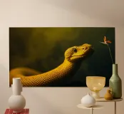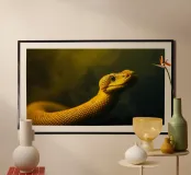 Le python jaune vif présente des écailles complexes et une expression curieuse, mettant en valeur son élégance dans un environnement faiblement éclairé qui rehausse ses couleurs vives.