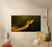 Gros plan sur un python jaune vif enroulé sur lui-même. hahnemühle