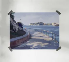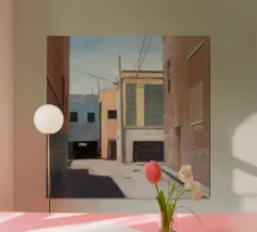 La géométrie austère d'une allée couverte est définie par des piliers cramoisis audacieux et les ombres longues et nettes qu'ils projettent dans la lumière vive du soleil. Cette peinture est une étude puissante de la lumière, de l'ombre, de la couleur et de la forme architecturale.