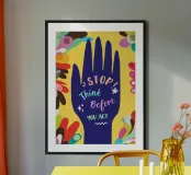 Partagez un message d'attention avec cette impression d'art numérique "Arrêtez de penser avant d'agir". Cette illustration contemporaine vibrante présente une main bleu foncé audacieuse qui sert de repère visuel, superposée à un message textuel clair et important. Entouré d'un ensemble vivant de formes abstraites colorées sur un fond jaune ensoleillé, le dessin est à la fois frappant et positif. Cette œuvre d'art à message graphique est parfaite pour encourager l'attention et l'action réfléchie dans n'importe quel espace. Cette reproduction numérique de haute qualité affiche une résolution de 7000x5000 pixels à 300 ppp, ce qui garantit une clarté exceptionnelle, des couleurs brillantes et une qualité d'image irréprochable.