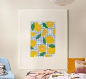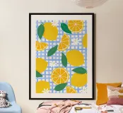 design de citron, motif d'agrumes, décoration de cuisine d'été, illustration de fruits, art à carreaux bleus, impression fraîche et vibrante