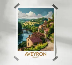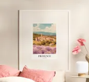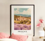 Plongez dans le charme idyllique de la Provence, en France, avec cette affiche numérique captivante. L'illustration présente un village pittoresque à flanc de colline, caractérisé par ses maisons traditionnelles aux toits de terre cuite et un clocher proéminent, niché au milieu de collines ondulantes. Au premier plan, des champs de lavande s'épanouissent dans de magnifiques nuances de violet, créant un contraste saisissant avec les tons terreux du paysage. Des cyprès et de la verdure luxuriante parsèment la scène, le tout sous un ciel doux et nuageux, capturant parfaitement l'essence sereine de la campagne française. Ce poster numérique de haute qualité