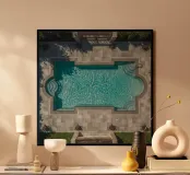 Vue aérienne d'une piscine rectangulaire avec un patio en pierre hahnemühle