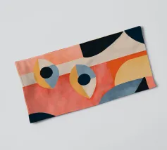 Une pièce abstraite sophistiquée avec des formes superposées et semi transparentes dans une palette chaude de rouge, de rose et d'ocre, créant de la profondeur et un sentiment de mouvement doux.