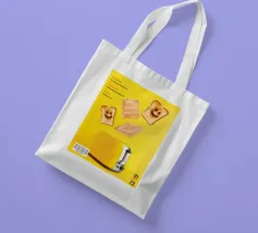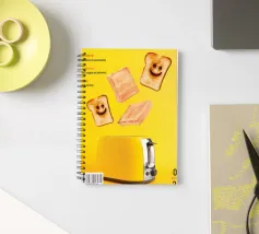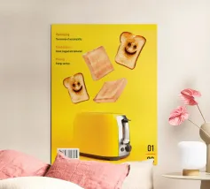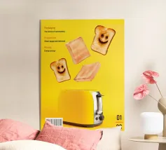 Des tranches de pain grillé avec des visages souriants flottent au-dessus d'un grille-pain jaune. L'arrière-plan comporte un texte sur l'emballage, la production et le mélange, qui met l'accent sur la durabilité et les économies d'énergie.