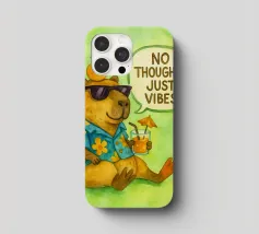 Un joyeux capybara portant des lunettes de soleil se prélasse sur un banc en dégustant une pastèque dans une ambiance tropicale. Le texte au-dessus indique "I'M NOT LAZY" et en dessous, "I'M JUST ON CAPYBARA TIME".