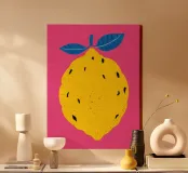 Un grand citron jaune illustré avec un style texturé et granuleux sur un fond rose vibrant. Cette œuvre est une interprétation pop art audacieuse, moderne et graphique d'un fruit classique.