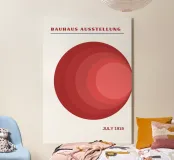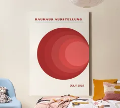 Cette affiche du Bauhaus Ausstellung, datant de juillet 1919 et présentant une forme géométrique monumentale, est visuellement captivante. Le dessin est dominé par une forme unique et massive composée de cinq cercles concentriques qui créent un dégradé visuel étonnant. Les couleurs passent magnifiquement d'un rouge sienne profond sur le bord à un rose corail/saumon lumineux au centre, créant une illusion optique de profondeur et de tridimensionnalité. La typographie "BAUHAUS AUSSTELLUNG" et "JULY 1919" encadre le dessin. Cette impression numérique à haute résolution (7000x5000 pixels, 300 dpi) offre des transitions de couleurs impeccables et est un excellent moyen de communication.