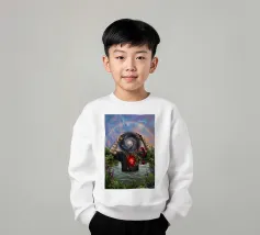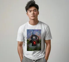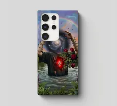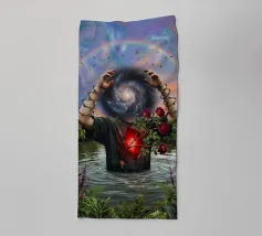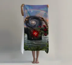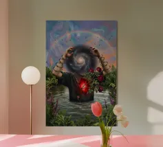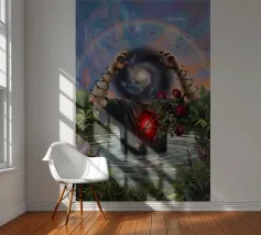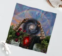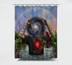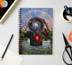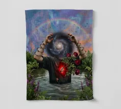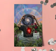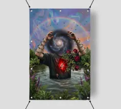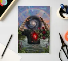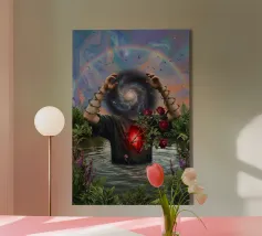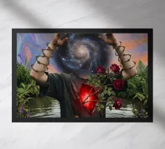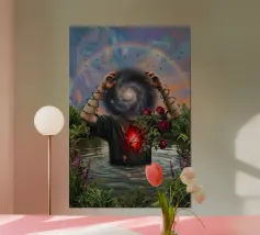 Plongez dans une scène surréaliste puissante où la nature, l'émotion et le cosmos s'entrechoquent. Une personne émerge d'un étang paisible, la tête transformée en une galaxie tourbillonnante, tandis qu'une lumière rougeoyante irradie d'une poitrine ouverte. Des roses éclatantes fleurissent à l'intérieur, symbolisant la renaissance, la vulnérabilité et la force intérieure. Les bras barbelés se tendent vers un ciel de rêve rempli d'arcs-en-ciel et d'oiseaux, créant un contraste spectaculaire entre la beauté et la lutte. Cette œuvre d'art saisissante est parfaite pour les amateurs de fantaisie, de symbolisme et d'art conceptuel expressif.