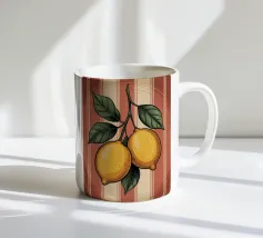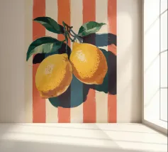 Frais et vibrant, Lemons On A Stripe est un tableau d'art mural rétro sur les fruits. Une illustration d'agrumes parfaite pour les cuisines, les salles à manger ou les intérieurs d'inspiration vintage.