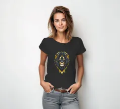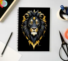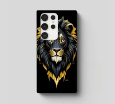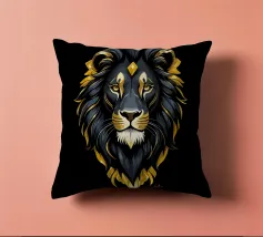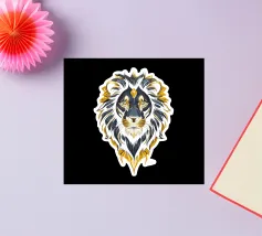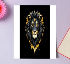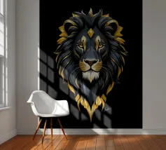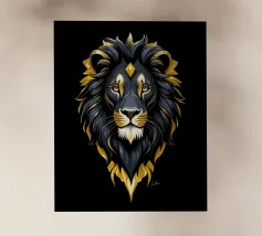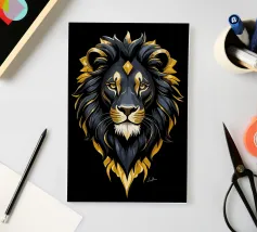 Une représentation king stylisée d'une tête de lion présente des détails complexes et une palette de jaunes doré vifs, sur un fond uni. La crinière du lion est accentuée par des formes nettes, semblables à des flammes, qui renforcent son allure majestueuse.