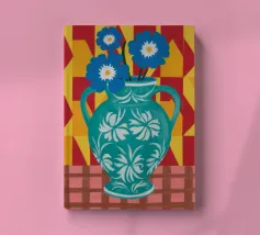 Un vase bleu abstrait de forme libre contient un bouquet coloré, posé sur une surface rose sur un fond beige, incarnant un style ludique et déconstruit.