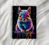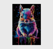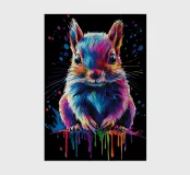 Un écureuil coloré regarde directement l'appareil photo avec de grands yeux expressifs. L'illustration utilise une large palette de couleurs vives - dont le bleu, le rose, le violet, le rouge et le jaune - qui font paraître le pelage vivant. Le dégradé de couleurs qui s'étend des oreilles aux pattes et qui se termine par des taches et des gouttes de couleurs vives est particulièrement frappant. Le fond est d'un noir profond, ce qui fait ressortir encore plus les couleurs brillantes et confère au motif un aspect moderne et dynamique.