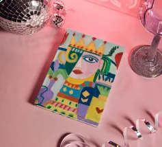 Cette peinture représente un masque aux couleurs vives et aux formes abstraites. La composition comprend des motifs géométriques, créant une expérience visuelle dynamique et énergique.