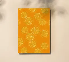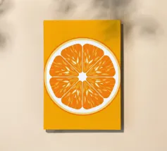 Un motif graphique, de style pop art, de tranches d'orange sur un fond bleu foncé. La composition est moderne, vibrante et constitue une conception fraîche, piquante et élégante.