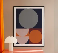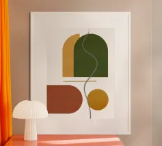 Simple Harmony Cette pièce explore l'équilibre tranquille que l'on trouve dans les formes géométriques simples et une palette de couleurs sobre. La composition est centrée sur un arc chaud en terre cuite, suggérant une porte ou un seuil architectural, qui est partiellement recouvert par un cercle vert sauge. Une délicate ligne horizontale et un petit point gris ajoutent de la précision à des formes autrement douces et organiques. Réalisé dans un style moderne et minimaliste, il crée un sentiment de calme paisible et d'équilibre intemporel.