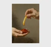 Une parodie pleine d'esprit inspirée de la peinture de la Renaissance, où une seule frite dorée tend la main vers un bol de ketchup riche.