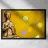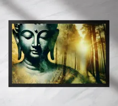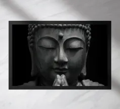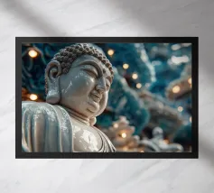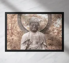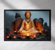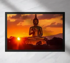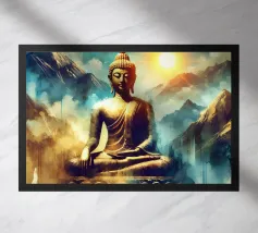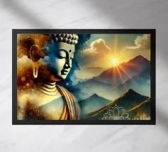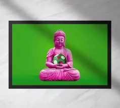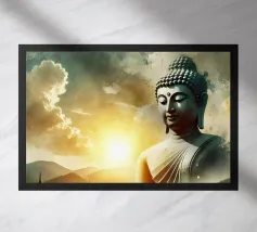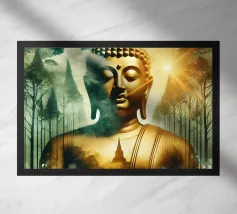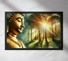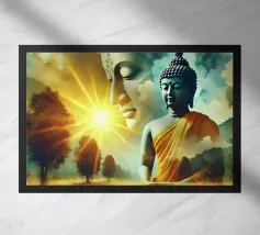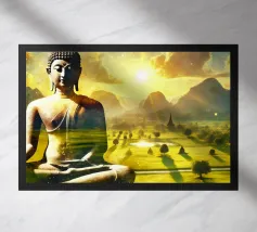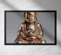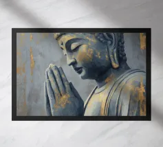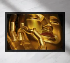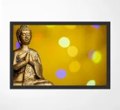 L'image montre une statue de Bouddha dorée sur un fond jaune vif avec plusieurs cercles de lumière. La statue est travaillée en détail et montre Bouddha dans une posture méditative, les mains jointes. La surface de la statue est brillante et structurée, avec des ornements visibles sur la robe. L'arrière-plan est composé d'un jaune intense, complété par des reflets de lumière colorés qui créent une profondeur visuelle et font ressortir la figure.