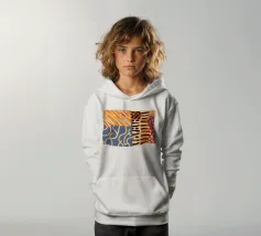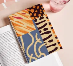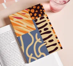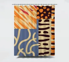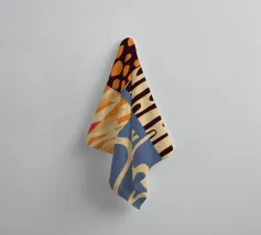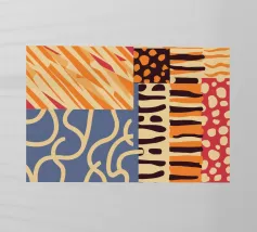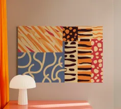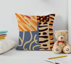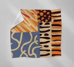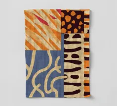 Une œuvre d'art abstraite composée de divers patchs texturés, y compris des imprimés d'animaux et des couleurs unies comme l'orange et le bleu, créant un patchwork moderne visuellement intéressant et harmonieux.