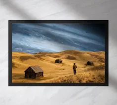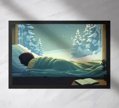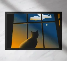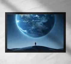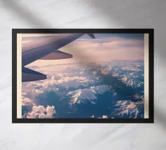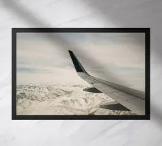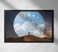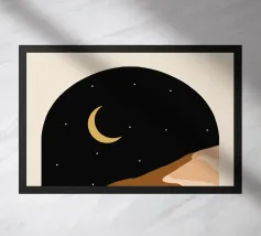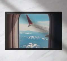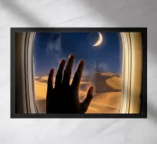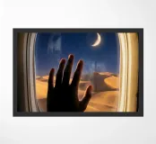 Découvrez la magie du voyage et du ciel nocturne grâce à cette œuvre d'art atmosphérique représentant une main qui touche délicatement le hublot d'un avion surplombant des dunes désertiques rougeoyantes. Un croissant de lune brille dans un ciel bleu profond rempli d'étoiles, créant un mélange serein d'errance et d'émerveillement. Les sables chauds et dorés contrastent magnifiquement avec les tons frais de la nuit, capturant le sentiment de solitude, de réflexion et de rêve au-dessus du monde. Parfait pour les amateurs de voyages, les minimalistes et les fans d'art cinématographique et de vues de fenêtre rêveuses.