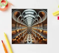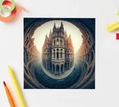 Cette image représente une disposition architecturale circulaire impressionnante, composée de grands bâtiments classiques modernisés convergeant vers le ciel. Une statue proéminente au centre renforce la perspective dramatique sous un ciel bleu nuageux texturé.