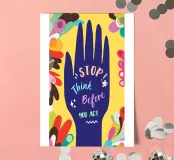 Partagez un message d'attention avec cette impression d'art numérique "Arrêtez de penser avant d'agir". Cette illustration contemporaine vibrante présente une main bleu foncé audacieuse qui sert de repère visuel, superposée à un message textuel clair et important. Entouré d'un ensemble vivant de formes abstraites colorées sur un fond jaune ensoleillé, le dessin est à la fois frappant et positif. Cette œuvre d'art à message graphique est parfaite pour encourager l'attention et l'action réfléchie dans n'importe quel espace. Cette reproduction numérique de haute qualité affiche une résolution de 7000x5000 pixels à 300 ppp, ce qui garantit une clarté exceptionnelle, des couleurs brillantes et une qualité d'image irréprochable.