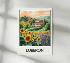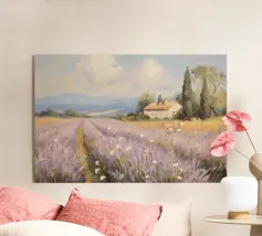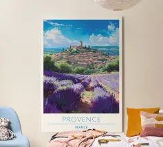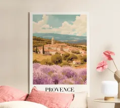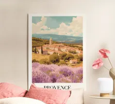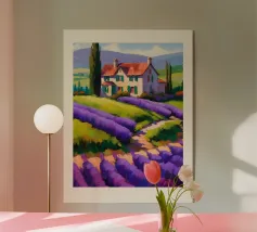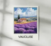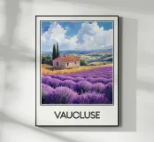 Affiche de décoration illustrant un paysage provençal du Vaucluse, avec des champs de lavande en fleurs, une maison en pierre traditionnelle et des cyprès. Une scène paisible et colorée, parfaite pour apporter une touche de sérénité et de charme méditerranéen à votre intérieur.