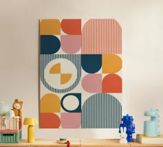 Cette image présente un motif géométrique coloré qui combine différentes formes et lignes abstraites. Le motif comprend des demi-cercles, des rectangles, des triangles ainsi que des lignes verticales et horizontales dans un mélange de couleurs douces et vives, dont l'orange, le jaune, le violet clair, le bleu tamisé et le pétrole. L'agencement répétitif de ces formes crée une composition à la fois ludique et équilibrée. L'utilisation de lignes irrégulières dessinées à la main confère au motif géométrique structuré une sensation de flux organique et de texture artistique. Le design global