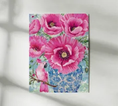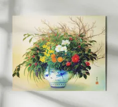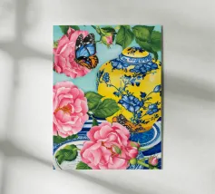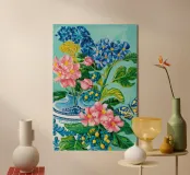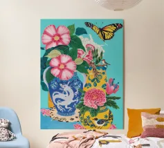 Une vibrante nature morte représentant un vase à motifs bleus et blancs débordant d'hortensias bleus et d'autres fleurs, avec des papillons, sur un fond turquoise vif.