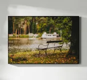 J'ai découvert ce banc isolé au bord d'un petit lac. J'ai pris cette photo au début de l'automne, alors que quelques feuilles vertes étaient encore accrochées aux arbres. Malgré cela, l'image transmet une belle ambiance automnale. Idéal comme poster sur le mur du salon ou de la chambre à coucher. Aussi comme décoration dans l'appartement ou la maison de vacances. :)