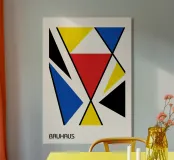 Une affiche abstraite très dynamique et déconstruite de style Bauhaus, dominée par un arrangement énergique de triangles. La composition utilise d'épaisses lignes noires pour délimiter diverses formes fragmentées remplies des couleurs primaires emblématiques (rouge, jaune et bleu), de noir et de blanc. L'œuvre d'art qui en résulte est un exemple frappant de tension et d'équilibre géométrique moderniste. Ce fichier d'art numérique de qualité supérieure est fourni à une résolution exceptionnelle de 7000x5000 pixels, 300 dpi, garantissant une netteté et une fidélité des couleurs exquises pour une impression murale époustouflante et à fort impact.