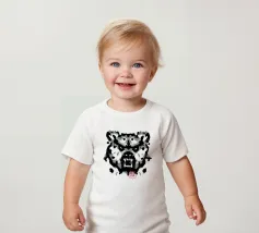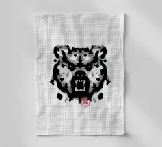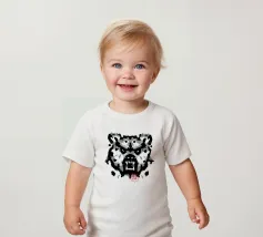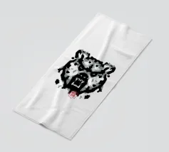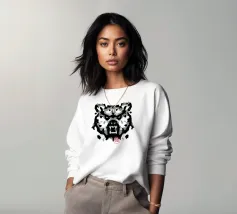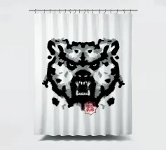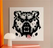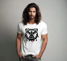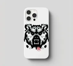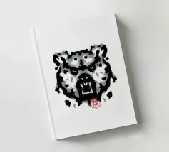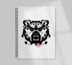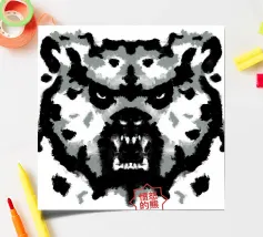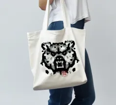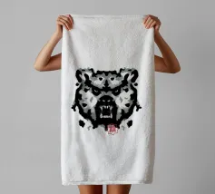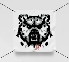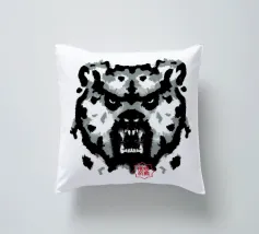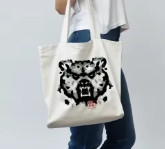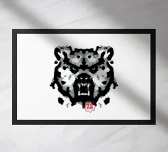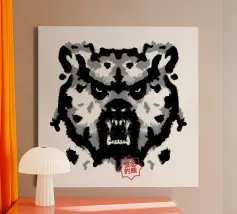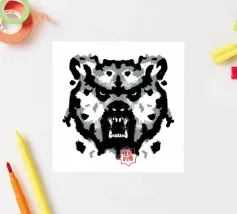 A bear face depicted in black and white with watercolor-like stains that evoke the aesthetic of a Rorschach test. This work of art expertly engages our interpretive skills, making it an ideal choice for bear lovers who enjoy the fun of perception