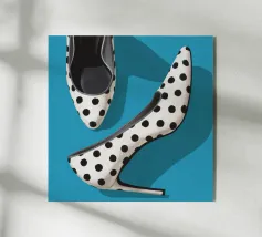A close up, low angle view of a person legs and feet wearing stylish high heeled shoes. The shoes are uniquely decorated with a blue sky and white cloud pattern, creating a whimsical and fashionable statement.
